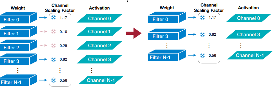 - Trainable scaling factor is multiplied to each output channel and channels with small scaling factor are pruned.