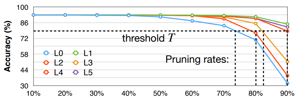 - Sensitivity analysis for per layer pruning ratio, by observing accuracy degrade with each pruning ratio.