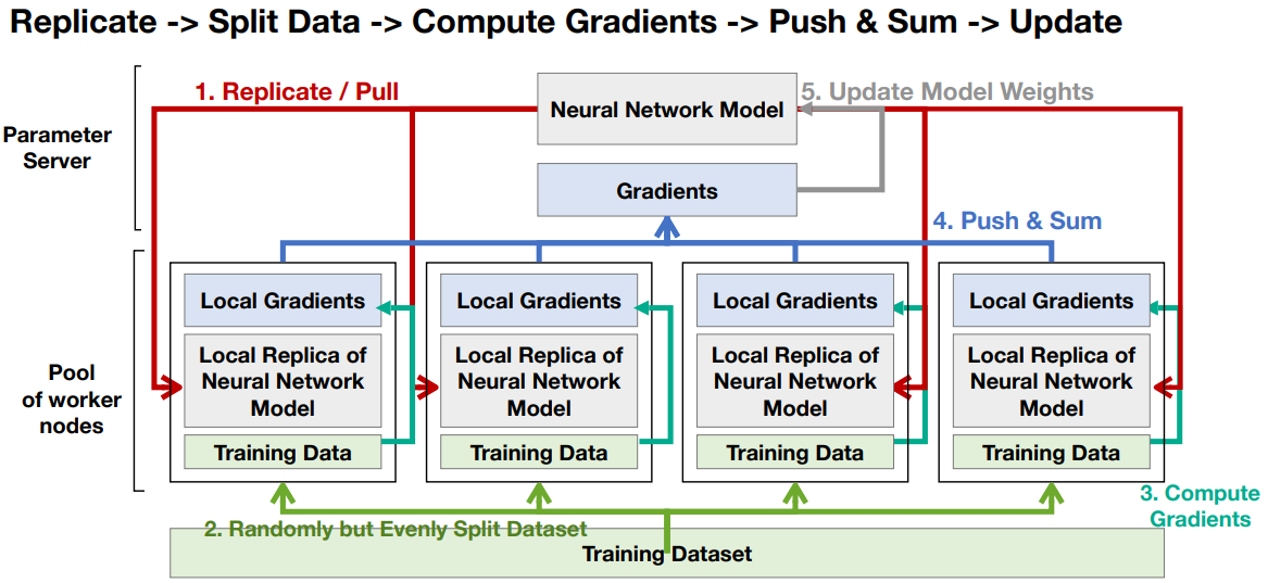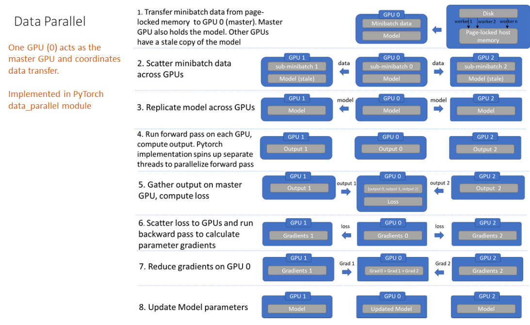 - Data Parallel:: Replicate model across gpu and distribute data across each gpu.