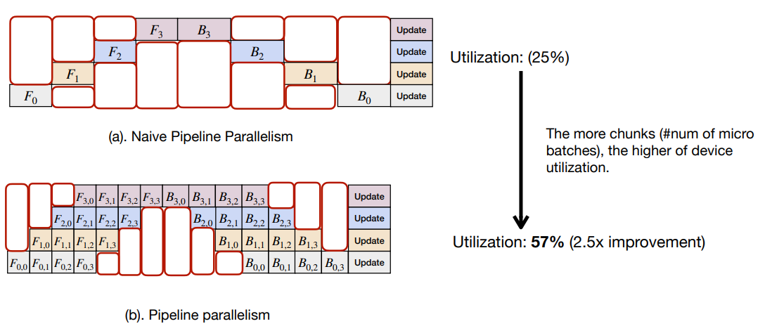 - Higher GPU idle time, it can be reduced using micro batches as shown above, still GPU utilization is poor compared to other techniques.