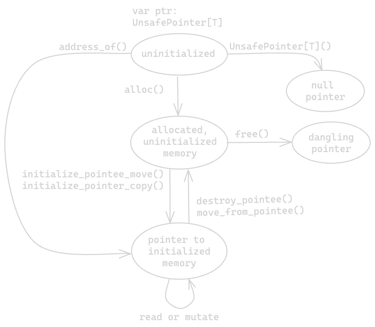 UnsafePointerandDTypePointervalues are nullable or can be initialized.- Mojo doesn’t track lifetimes for the data pointed to by an