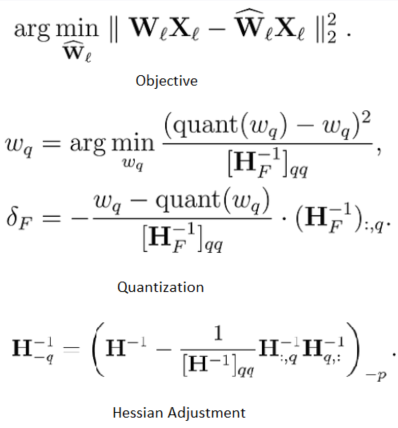 - Quantization Process: Quantize the easiest weight first Wq, then adjust remaining non-quantized weights using $\delta$F to compensate for the quantization error using the Hessian matrix.
